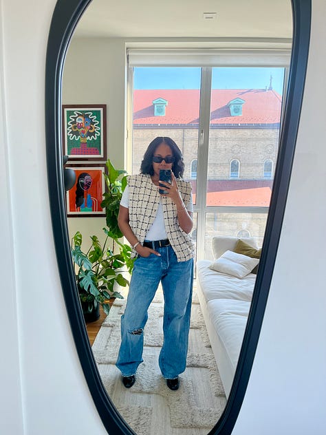 Middle row (left to right): Officine Générale vest, Frame jeans (previously linked); English Factory vest, Gap jeans (previously linked); Pixie Market bustier top.